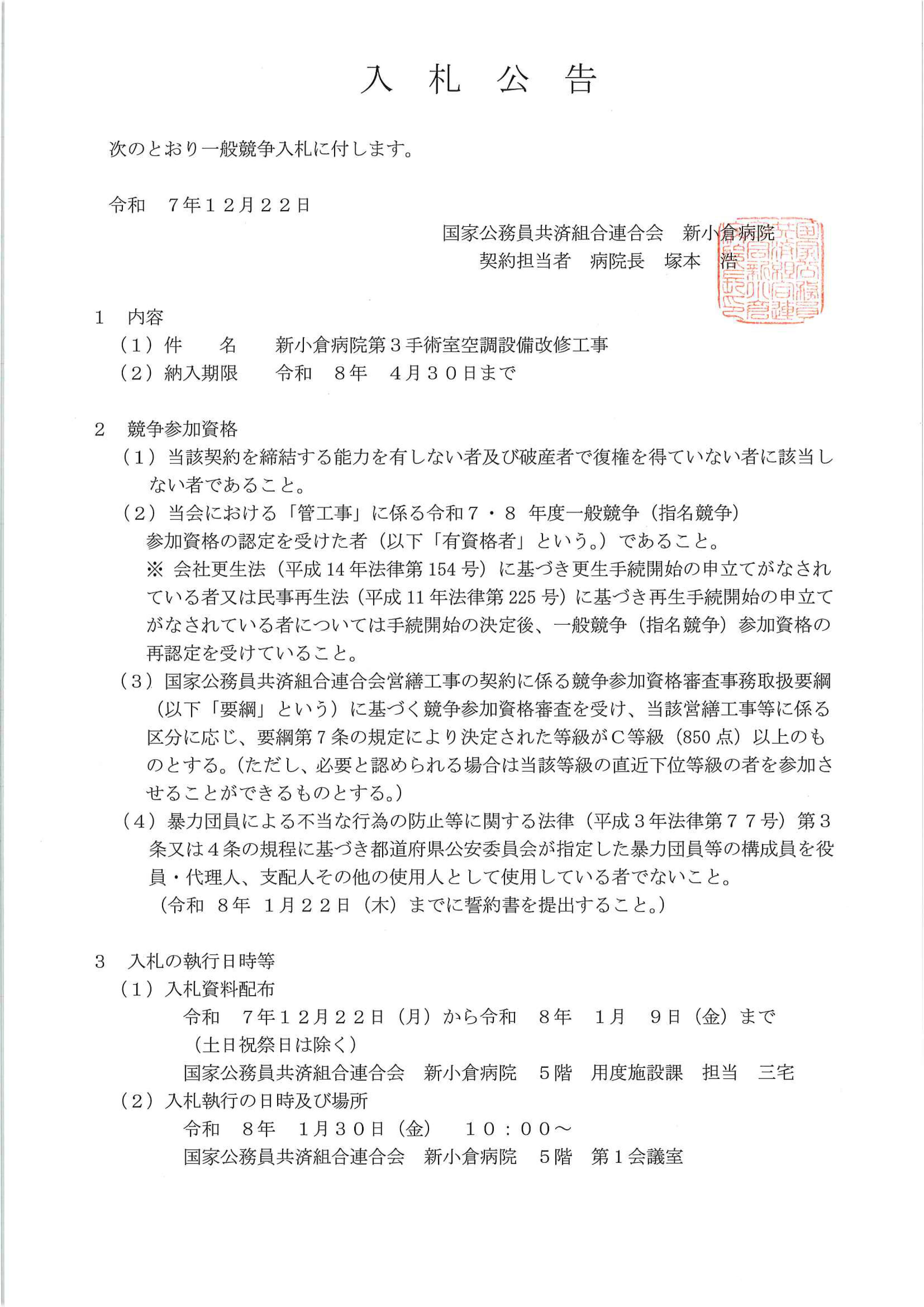 入札公告(新小倉病院第3手術室空調設備改修工事)について
