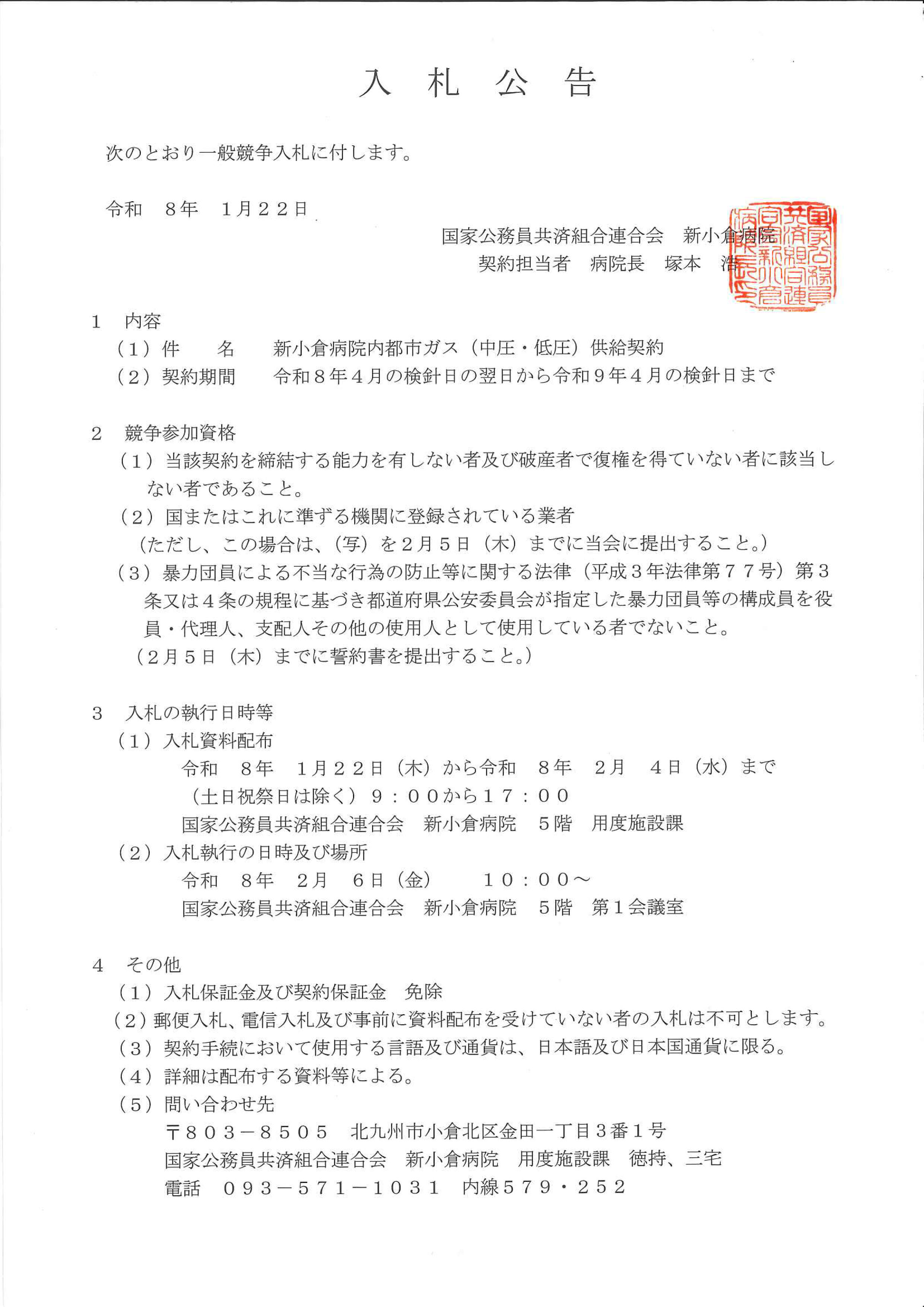入札公告(新小倉病院内都市ガス(中圧・低圧)供給契約)について