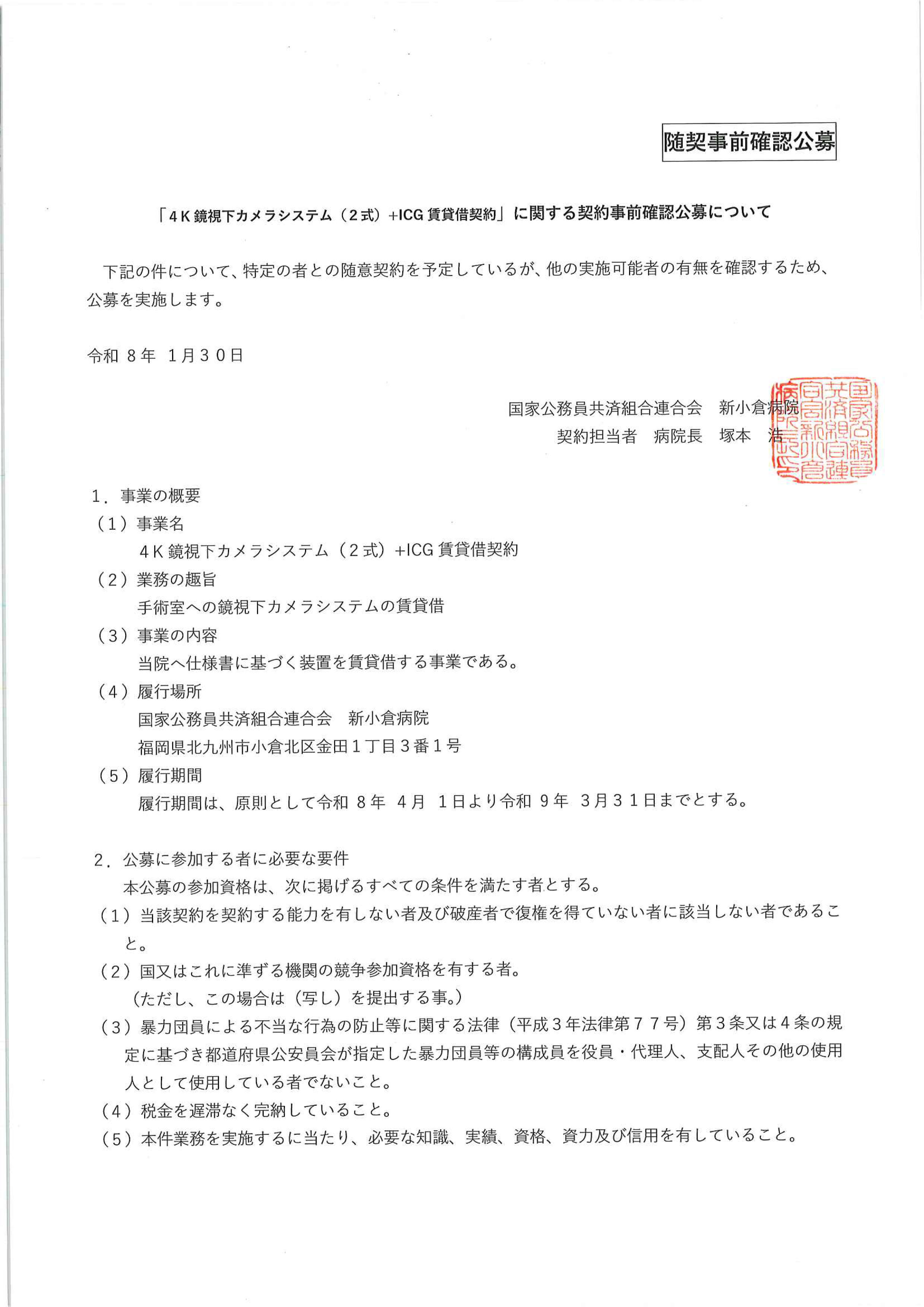 「4K鏡視下カメラシステム(2式)+ICG賃貸借契約」に関する契約事前確認公募について