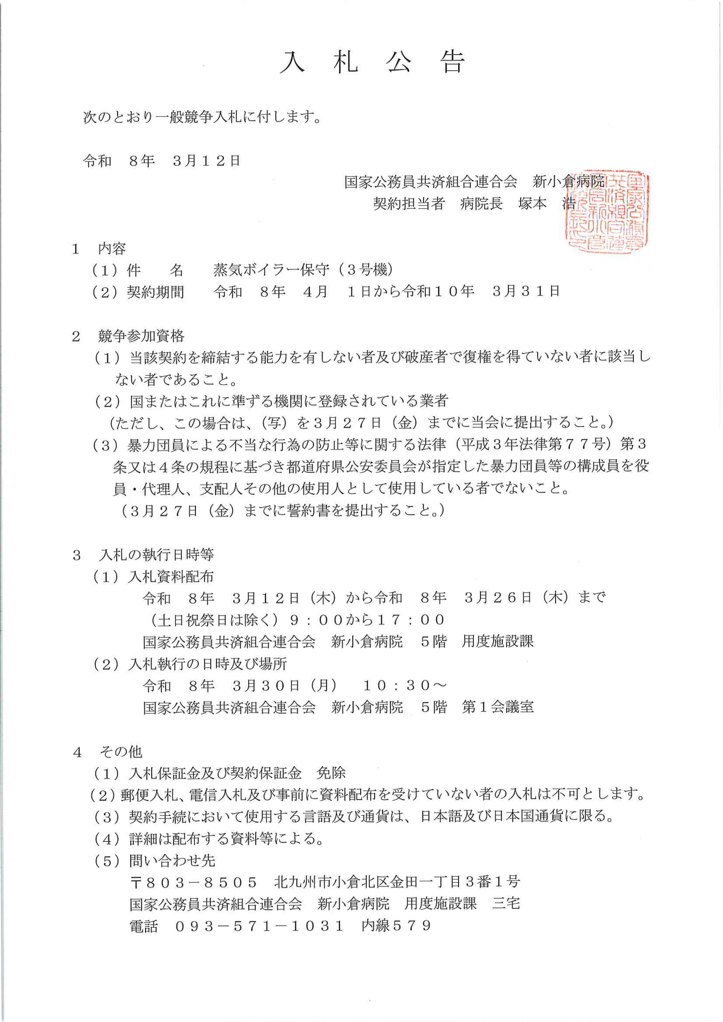 入札公告(蒸気ボイラー保守(3号機))について