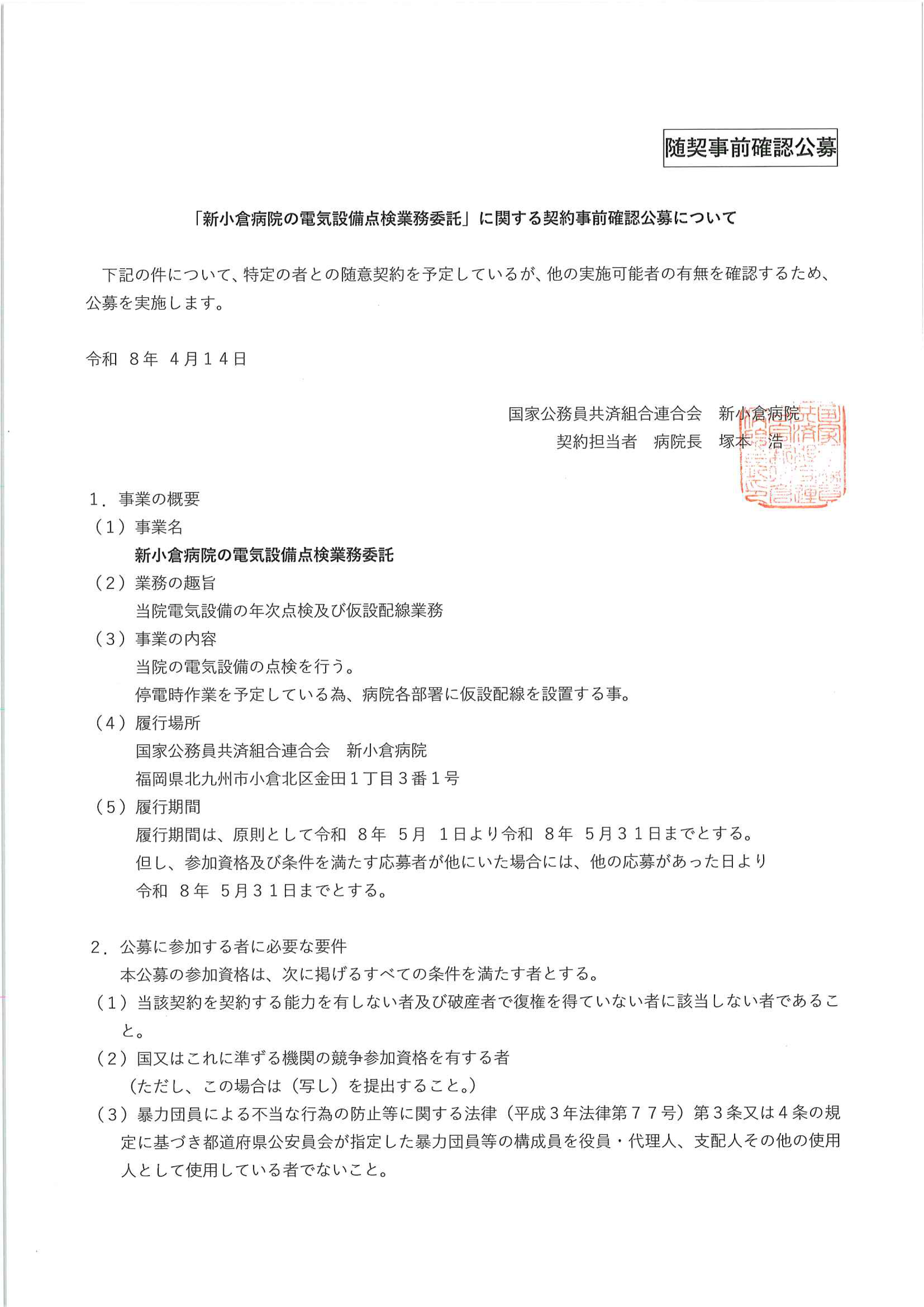 「新小倉病院の電気設備点検業務委託」に関する契約事前確認公募について